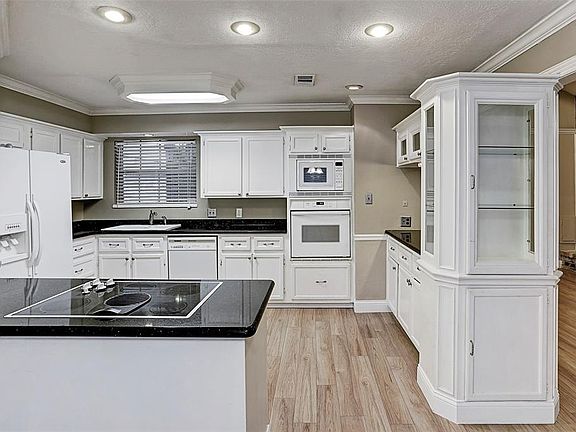 Lovely home in Timber Lane Subdivision; Welcoming Front Porch; Beautiful white display cabinetry in Kitchen with contrasting black granite counters, recessed lighting, electric stove top, oven and microwave; dual sink vanity in master bathroom with spa tub/shower combination; extra large living room with fireplace and pitched ceiling; covered back patio too!