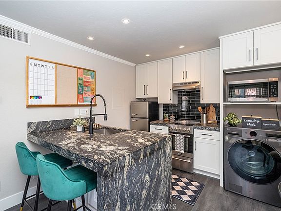Discover an unparalleled resort-inspired lifestyle in this extensively remodeled studio end-unit at the highly sought-after Las Palmas Community in Mission Viejo. This home offers a true open living concept, maximizing space and flow, and can be purchased fully furnished!! Step inside to a showpiece kitchen featuring a striking Italian-made stone waterfall countertop complemented by matching Italian marble. The upgraded bathroom is equally impressive with exquisite Italian stone, a beautifully redone shower utilizing a tall hot mopping waterproof technique, stylish jade green tile, new shower doors and fixtures, and a high-performance exhaust fan. Elegant hardwood flooring flows throughout the entire unit. Recent interior improvements ensure a move-in ready experience: a new kitchen backsplash, shelf, sink, faucets, and garbage disposal, along with new appliances, fresh paint, light dimmers on all recessed lighting, and a Sensi smart thermostat. For ultimate convenience, a 1-car garage is located directly below the unit. Enjoy significant savings as water is included in the HOA dues – the only utility the owner pays is electricity! This is more than just a home; it's a gateway to an exclusive lifestyle with unparalleled access to the renowned Mission Viejo Lake. As a resident, you'll enjoy swimming beaches perfect for relaxing and soaking up the California sun, boating and paddleboarding on pristine waters, and fishing opportunities for all skill levels. The lake also hosts various community events and activities throughout the year, fostering a vibrant and engaging atmosphere. Enjoy leisurely strolls along scenic lakeside pathways and take in the scenic beauty that this remarkable amenity provides. Located in a prime area, residents benefit from the desirable Las Palmas community amenities and the convenience of Mission Viejo's offerings, all enhanced by the direct access to Mission Viejo Lake. This is your chance to embrace a truly exceptional living experience!