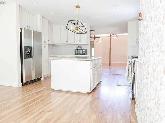 The chef's kitchen boasts stone countertops, a marble island, tiled backsplash, and crisp white cabinetry with modern hardware. A cozy breakfast nook opens to one of three sliding doors that lead out to the wraparound yard.