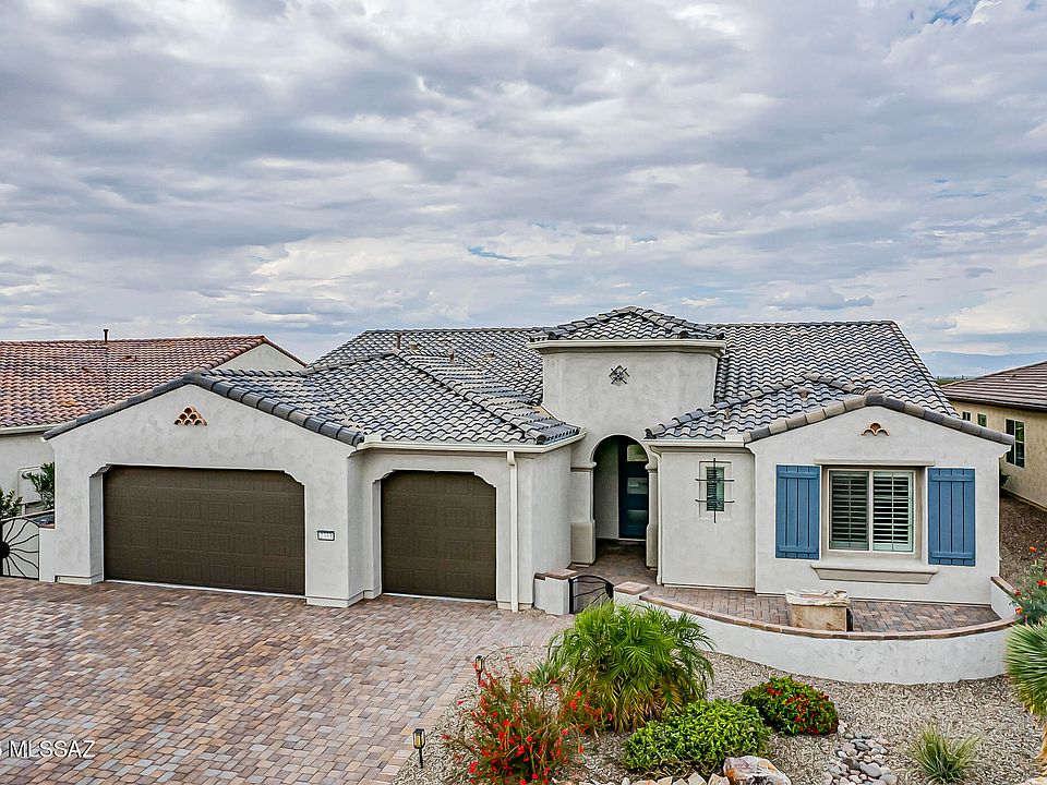 This like-new Tesoro model home is located in the highly sought-after Quail Creek Resort community--an active adult community where every day feels like a vacation. With an impressive list of upgrades and options, this home offers truly worry-free living so you can take advantage of all the community has to offer, including golf, pickleball, clubs, activities, events, and so much more. From the moment you arrive, the curb appeal shines with a fully pavered driveway that extends to the inviting front courtyard and entry. The low-maintenance landscaping is meticulously cared for, creating a warm and welcoming first impression. Enjoy quiet mornings or casual evenings out front around the firepit as you wave to neighbors passing by or stop for a friendly chat. Step inside, and you'll immediately feel the home's warmth and spaciousness. A wide foyer with a tray ceiling and luxury vinyl plank flooring that runs throughout most of the home sets the tone for what's ahead. Your eyes are naturally drawn through the open living room and out the large center-opening sliding glass doors to the inviting outdoor living area and backyard beyond. The living room is both comfortable and elegant, featuring a custom built-in entertainment wall perfect for hosting family movie nights or watching the big game with friends. A stylish wet bar with a wine fridge and extra cabinetry makes entertaining easy and enjoyable. The Great Room concept keeps everyone connected whether you're in the kitchen, dining area, or living room. The kitchen is nothing short of stunning, with painted cabinetry, 1¼-inch overlay doors, crown molding, a wrap-around island pony wall with matching cabinet skins, roll-out shelves, soft-close doors, LED under-cabinet lighting, and beautiful quartz countertops. This chef's dream kitchen combines both function and style, with modern appliances that make it easy to create your favorite meals or try new recipes. The breakfast bar on the island is the perfect spot to catch up on the latest news or scroll through your phone while staying part of the conversation. Storage is abundant with a fully outfitted butler's pantry and a large walk-in pantry ideal for organizing small appliances, cookware, and all your culinary essentials. The elegant dining area, extended by two feet, features a stunning chandelier and ample room for a large dining table. Whether you're enjoying holiday meals, tackling a puzzle, or hosting happy hour, this space is ready for any occasion. A sliding glass door opens directly to the outdoor living area, making it simple to serve meals from the kitchen or barbecue outside with ease. Natural light fills the home through an abundance of thoughtfully placed windows. The primary suite is spacious and serene, with high ceilings and a custom architectural accent wall that adds a touch of luxury. This bedroom was extended two feet to provide additional room for a reading chair or extra furnishings, and the large windows overlook the tranquil backyard. The spa-inspired primary bathroom features an alternate layout with dual vanities, a makeup area, quartz countertops, framed mirrors, and stylish lighting. The tiled walk-in shower has a built-in bench seat, a decorative accent band, and 3\8-inch glass enclosure. The oversized walk-in closet offers exceptional organization, including a shoe rack and plenty of space for casual, active, and formal wear. The home's split bedroom design ensures privacy for guests. The guest suite includes its own accent wall and private en-suite bath with a beautifully tiled tub/shower, quartz countertops, painted cabinetry, and framed mirrors accommodations so nice your guests may not want to leave! A large, extended office/den provides flexibility for your lifestyle needs. Use it as a home office, reading room, hobby space, or even a cozy TV den the choice is yours. A deep hallway storage closet is perfect for holiday décor or household supplies, and a powder room with a pedestal sink, framed mirror, and comfort-height toilet is conveniently located for day-to-day visitors. The oversized laundry room features full matching cabinetry, a sink with a drip rod, and both gas and electric dryer hookups. The generous garage offers epoxy flooring, a 240-volt outlet for electric car charging, and high ceilings that accommodate a workshop or additional storage. The dedicated golf cart garage is ideal for quick community trips, as golf carts are a favorite mode of transportation in Quail Creek. Step outside to the backyard and you'll find an entertainer's paradise. The large, covered patio, finished with pavers, features an electric fireplace, ceiling fan, recessed lighting, and a solar tube for natural illumination. Enjoy morning coffee or evening cocktails while appreciating the privacy and beauty of the space. Pavers extend to a charming fountain that provides the soothing sound of trickling water, as well as to a built-in gas BBQ island complete with countertop space and an umbrella for shade. Artificial turf, decorative rock, low-care plants, and a combination of slump block wall and view fencing complete this relaxing oasis. After a busy day enjoying all Quail Creek has to offer, unwind in the hot tub under the spectacular Arizona night skies. Rain gutters have been added to help with water control during monsoon season, adding yet another thoughtful touch to this already perfect home. With accommodations this nice, you may never want to leave. This is truly a gem in one of Green Valley's premier resort communities don't miss your chance to call it home.