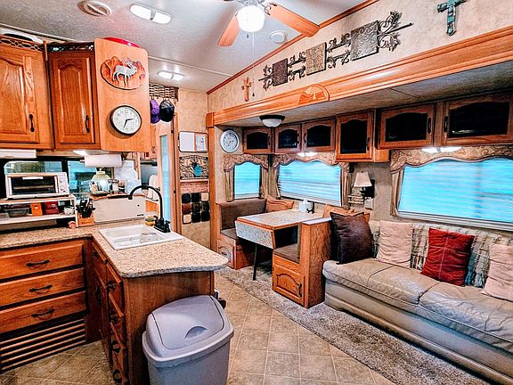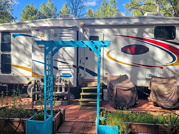 Step into comfort and convenience with this 2008 Keystone Montana Mountaineer 5th Wheel, a 34' x 8' retreat nestled in the heart of Lakeside, AZ. This well-maintained home-on-wheels has been thoughtfully upgraded to maximize livability, featuring brand-new carpeting, an on-demand water heater, and a second air conditioner for year-round comfort. Two spacious awnings extend your living area outdoors, creating the perfect shaded porch for morning coffee or evening gatherings. An 8' x 12' shed stocked with tools ensures you're ready for projects big or small, while the cozy interior makes this an inviting place to call home. Whether you're seeking a seasonal getaway or a full-time residence, this 5th wheel offers the perfect balance of practicality and charm in a welcoming community. Located in the Homestead Road Ranch 55+ Mobile Home & RV Resort, this property benefits from a community designed specifically for retirees who value both comfort and connection. The park offers fully equipped sites with water, sewer, electricity (30 & 50 amp), and complimentary Wi-Fi, along with an on-site laundry facility. With year-round accommodations and seasonal options, Homestead provides flexibility for both permanent residents and snowbirds. Lot rent is affordable, with RV sites starting at $620/month plus electric, making it one of the most cost-effective ways to enjoy the White Mountains. The park emphasizes a safe, quiet, and friendly environment, where residents can enjoy nearby hiking, golfing, and ATV adventures while still having the peace of mind of a well-managed community.