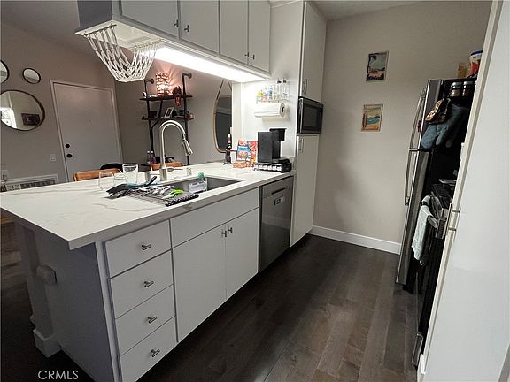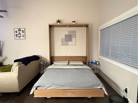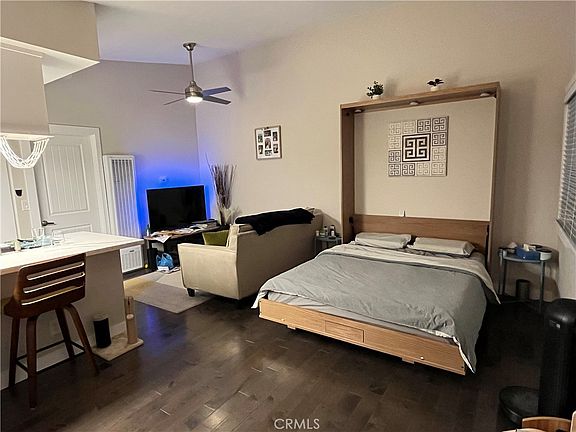 Studio unit, upstairs, pool view, no neighbor above or below. The unit is updated with gorgeous laminate flooring in the living area and beautiful tile in the bathroom. There is a walk in closet, double door shower, and large kitchen countertop which serves as an eating area. Also has a wonderful Murphy bed that can be closed for added space. Some of the main points: one parking space in a carport with storage, guest parking with pass, electric oven, fridge, dishwasher, garbage disposal, microwave, heat/AC, plenty of storage, dual pane windows, ring doorbell, security door, community pool and jacuzzi, and community laundry right by the unit. Close to freeways, shopping, 17 minutes from the beach.