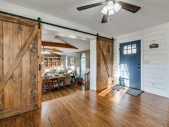 You will experience true tranquility and beauty in this lovely updated 3 bedroom 2 bath home. Owners recently improved this home with a stunning den/great room which is appointed with dropped beam ceiling, a stone wood burning fireplace. This fireplace along with the beautiful stone fireplace with hearth in dining area will reduce need for use of central heat throughout the home. Multiple arched windows bathe this room with gorgeous natural light. Hardwood floors complete this inviting area. The spacious kitchen features a huge center island with bar seating, tons of cabinets, beautiful wood flooring, updated appliances. Kitchen opens to large dining area which will accommodate large dining table and accessories. You can enjoy cozy, warm meals by the warmth and light of the second stone fireplace. The bedroom wing features master bedroom and bath with large walk-in shower. Two additional bedrooms, each with spacious walk-in closets. Country life continues to the outdoors. The home features a large deck porch which wraps around 2 sides. You will truly enjoy peaceful evenings listening to the quiet and overlooking the beautiful pond and wooded area. The oversize 2 car garage has been modified to use as a wood working shop but all structural components were maintained to allow for an easy conversion back to a garage if desired. Additional buildings include a 80X30 metal workshop with additional concrete slab, oversize doors and electric. This charming property also features 20 acres of land, a large pond, a creek at back of property and partial wooded areas. Home is NOT in a Flood Area that requires flood insurance however the back portion near the creek is in a designated flood area.