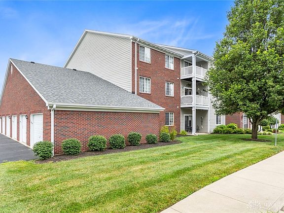 Welcome to easy living in this ground-level unit featuring 2 spacious bedrooms, 2 full bathrooms, and a versatile bonus room, ideal for a 3rd bedroom, home office, or den. Both bedrooms offer walk-in closets, and the kitchen with breakfast bar opens to the main living area, creating a comfortable and functional space for everyday living or entertaining. Step out and relax on your covered patio and enjoy the added convenience of a detached storage garage complete with a garage door opener for ease of access. All appliances convey, including washer and dryer, just move right in! Enjoy a low-maintenance lifestyle with HOA fees covering hazard insurance, water, trash, all exterior maintenance, lawn care, landscaping, and snow removal. Community amenities include a pool, clubhouse, and private fitness center. The building features secured entry with intercom-controlled access for added peace of mind. Conveniently located near Wright State University, WPAFB, restaurants, and shopping. A fantastic opportunity to own in the sought-after Misty Creek community!