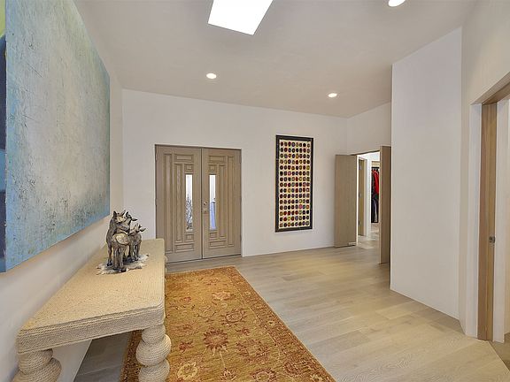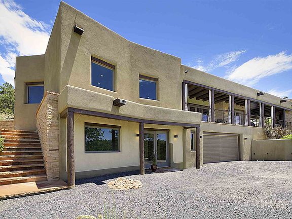 Extraordinary 5 bedroom 4.5 bath contemporary Pueblo style home and guest house on 12 acres in the exclusive Wilderness Gate subdivision, backed up against national forest on two sides of the property. A wide foyer leads into open living and dining areas with high ceilings and patio doors to a flagstone portal with stone fireplace with mountain and wilderness views. A stylish gourmet kitchen is appointed with a center island, double oven, 5-burner cooktop, Bosch dishwasher, under counter microwave and wine cooler plus a separate breakfast area. Split bedroom floorplan. The luxurious master suite has a fireplace and a spa-like bath with soaking tub, steam shower, heated towel racks, powder room and dual walk-in closets. With generous wall space everywhere, this is a home that art collectors will enjoy. There is a detached studio with plentiful light for artistic pursuits. A separate Pueblo traditional style 1,280 sq. ft. guest house has 2 bedrooms, full kitchen, living area, bath and deck surrounded by trees. An excellent property for reunions, large scale entertaining and outdoor living and dining. Green features include Bosch geothermal heat/cooling, solar voltaic electricity (26 solar panels), rainwater and greywater harvesting for garden irrigation, Energy Star appliances, low flow fixtures. The Wilderness Gate community is located between the historic Eastside and the Santa Fe National Forest. Direct access to numerous trails--all within 5 miles from downtown.