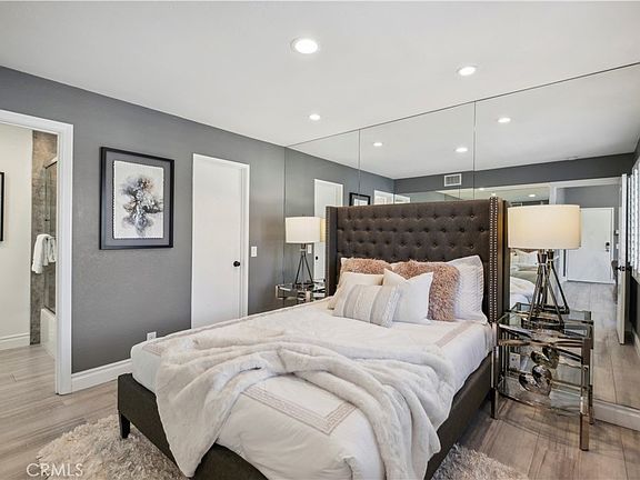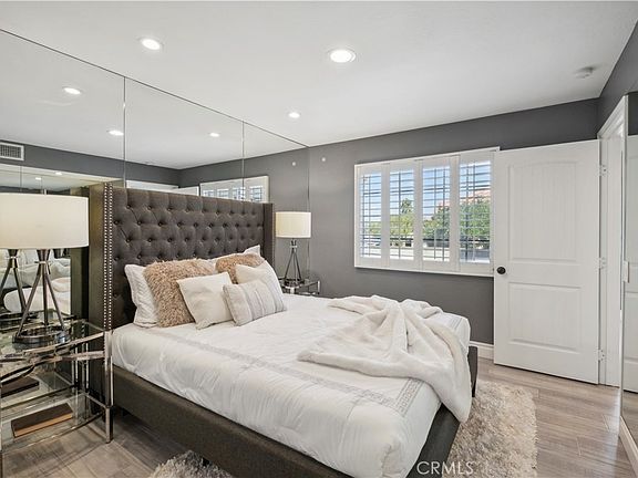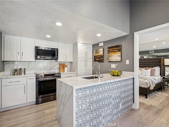 Step into contemporary elegance as you enter this beautifully renovated 2-bedroom, 2-bathroom upper unit condo located in Las Palmas in Mission Viejo. Featuring modern tile flooring throughout, this home exudes sophistication and style. The spacious, open floor plan is bathed in natural light, thanks to a large sliding glass door that leads to a private balcony—ideal for both indoor and outdoor entertaining. The heart of the home boasts a chef's dream kitchen with a striking waterfall island, sleek stainless-steel appliances, and recessed lighting that highlights every detail. Retreat to the luxurious dual primary suites, complete with mirrored closet doors, recessed lighting, and ensuite bathrooms. Each bathroom is a haven of relaxation with gray tile flooring, quartz slab countertops, one with a custom tile walk-in shower and the other with a tub/shower combo, built-in speakers, mirrors with LED lighting, and bidet toilets. This condo seamlessly blends modern comfort with thoughtful design, making it a perfect place to call home.