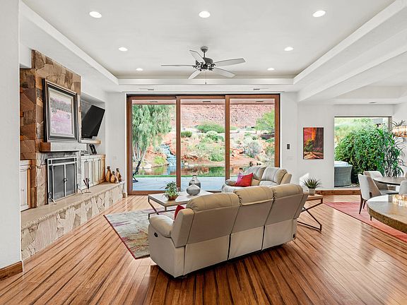 OPEN HOUSE Feb 17 & 18 10-2.This incredible home offers stunning red rock views, 3 bedrooms, each with its own ensuite bathroom, a den (with no closet) that could be a 4th bedroom, and 4 full bathrooms. Each of the 3 bedrooms has a door to the exterior and its own private outdoor patio space. The back wall of the home has a retractable door, basically an entire wall, that opens the home to interior and outdoor living spaces. You will fall in love with the several waterfalls that cascade into the backyard water feature, and will appreciate the secluded yard, hot tub, and outdoor kitchen. This beautiful home features multiple skylights and sola-tubes that bring natural light into virtually every space. It comes with an Associate Membership to the Entrada Country Club. Membership in t