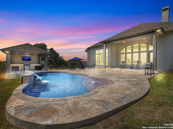 This beautiful single-story home in Vintage Oaks at the Vineyard perfectly combines Hill Country charm with modern comfort. Designed with everyday living and entertaining in mind, it offers spacious rooms, thoughtful details, and inviting outdoor spaces. The open floor plan features a large living area with a stone fireplace and abundant natural light. The kitchen is the heart of the home, complete with stainless steel appliances, a gas cooktop, custom cabinets, and a big center island-perfect for cooking, gathering, and making memories. The primary suite provides a quiet retreat with a spa-like bath featuring dual vanities, a soaking tub, and a roomy walk-in shower. There are three additional bedrooms, including one with its own private en-suite bathroom, ideal for guests or family members who need extra privacy. A dedicated game / movie room adds even more space for fun and relaxation. Outside, enjoy your own private getaway with a sparkling pool and covered pergola, perfect for weekend barbecues or quiet evenings under the stars. Living in Vintage Oaks means access to amazing neighborhood amenities, including multiple pools, a lazy river, fitness center, sports courts, scenic trails, and a true sense of community. This home offers the best of Hill Country living-comfortable, inviting, and ready to enjoy.