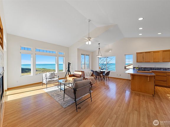 Perfectly nestled into the Whidbey Island coastline, this custom-built coastal retreat captures breathtaking high-bank waterfront views stretching from The San Juan Islands, down the Strait of Juan de Fuca, to the majestic Olympic Mountains. Thoughtfully designed to embrace its extraordinary setting, this 2-bedroom and 2.25-bath home is filled with natural light and a calming coastal aesthetic. Expansive view windows invite the outdoors in, while warm, custom details create a space that feels both refined and relaxed—perfect for an island escape or full-time living. Relax in the spacious living room w/ high ceilings and fireplace, create your favorite meals in the spacious kitchen/dining, or step out back to the private deck overlooking West Beach with expansive water views and stunning sunsets year-round. Enjoy the dedicated office, ideal for remote work or creative pursuits. A spacious two-car garage provides everyday convenience, while an additional garage/shop offers the perfect space for hobbies, storage, or projects. With mindful attention to detail, opportunity to bring your personal touch, and island living that dreams are made of, consider this your own private island retreat, close to amenities and a just quick drive to NAS Whidbey.