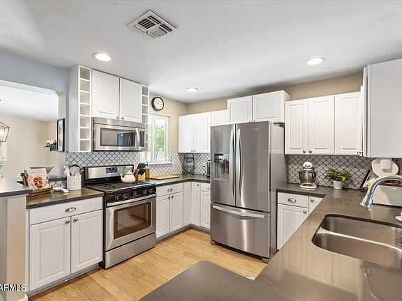 Commute in minutes from Downtown Phoenix to this quiet neighborhood where your charming home and relaxing backyard await. The home has over 1900 sq ft, 3 bed, 2 bath, plus an optional office or playroom, a split floorplan and oversized laundry utility room. In the primary bedroom suite with a beautiful accent wall, you'll find a walk-in closet, dual sink bathroom with a luxurious marble shower and make up counter, and also additional backyard access. Wood flooring, a chef's kitchen that opens to the family room, and other design elements fill the home with timeless character. With no HOA and a blissful backyard both with shaded real grass, a turf play area, garden, mist system, and patio dining under bistro lights and a modern chandelier - you'll never want to leave home!