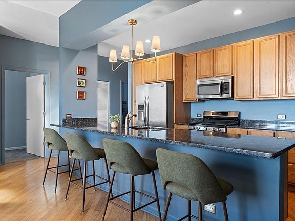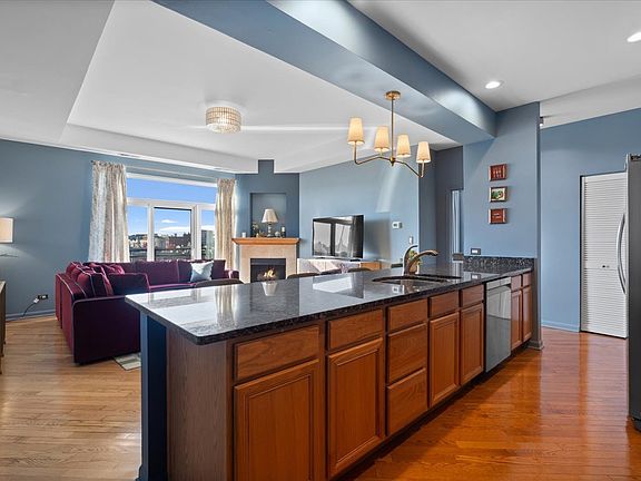 You won't want to miss this top-floor, highly desirable south-facing penthouse in the Riverfront Community. The perfect 2 Bed, 2 Bath in Avondale/Logan Square. This beautifully updated residence combines comfort, style, and convenience with a sun-filled open layout, southern exposure, walk-out balcony and unobstructed city skyline views. The kitchen features wood cabinetry, granite countertops, an oversized island, stainless steel appliances, and a pantry. The spacious extra wide living room features a cozy gas-starter fireplace. Recent updates include fresh paint throughout, refinished hardwood floors, new bedroom carpeting, modern lighting and hardware, and an updated bath vanity. The spacious primary suite offers an ensuite bath with dual sinks and a tub/shower combo, plus generous closet space. Just down the hall you'll find a large second bedroom, full guest bath, and newer washer/dryer. Additional storage is located on the second floor, and two parking spaces are included (heated garage and one gated carport.) Experience Riverfront living at its best. Modern finishes, ideal location, and unbeatable access to I-90/94, the CTA Brown and Blue Lines, and nearby neighborhoods including Lincoln Park, Logan Square, Avondale, and Bucktown.