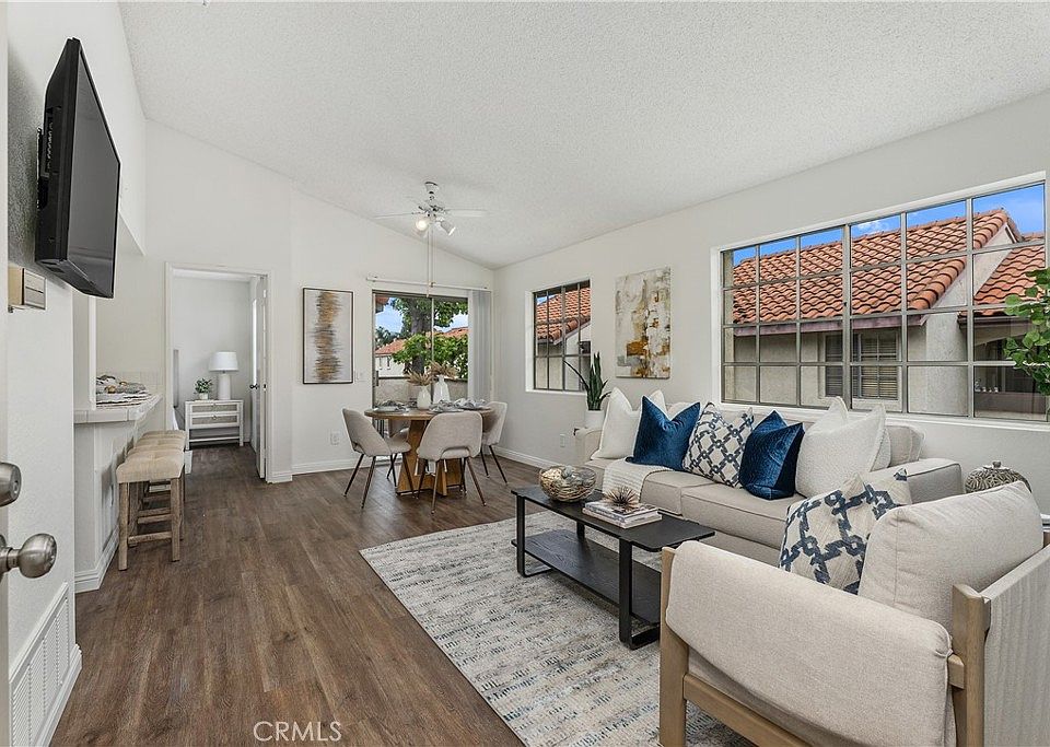 YOU MADE IT TO LAKE LIFE! Welcome to your fresh, fun pied-à-terre in MV where home feels like vacation. Lake membership lets you balance work & play! Enjoy concerts & boating as part of your everyday. Perfect for a work-from-home setup, hosting guests, or living life on your terms. A blend of Privacy & Possibility as this thoughtfully designed bright & entertainer-ready home offers two primary ensuite bedrooms & two full baths, giving the flexibility & privacy whether living solo, sharing with a roommate, or enjoying multi-generational living. Want to watch over your car like a hawk? Set on an upstairs corner location, you can admire it from your perch while enjoying an open view. The first suite includes custom office cabinetry, ideal for a home office, study area, or creative retreat. Above both suites is a giant attic to store all your files, holiday decorations & childhood treasures. Hate long walks from your car or the laundry? You won’t have to. Your two parking spaces, including a covered carport with storage, are just steps from your front door, & your new home includes a washer & dryer, making daily life stress free. This open floor plan features vaulted ceilings, luxury engineered flooring & a spacious deck perfect for morning coffee, happy hour sunsets & weekend gatherings. Freshly painted, & includes a newer stove for romantic dinners at home & then natural light keeps the morning vibe relaxed. Enjoy sparkling pools, a clubhouse, and water & trash included in your HOA fees, plus membership to the lake, your all-access pass to beach & swimming, boating & unforgettable summer concerts. The entire Las Palmas community was re-piped in 2019 for added peace of mind. Into sports or outdoor fun? High Park nearby offers sand volleyball, two baseball diamonds, a children’s playground, & open fields for weekend fun. Love hiking or biking? Whiting Ranch is also nearby with scenic trails for all levels. Close to It All! Love weekend adventures? You’re just minutes from Irvine Spectrum, Laguna Beach, Newport Beach & surf spots in San Clemente, plus whale watching in Dana Point. Craving nightlife? LA & San Diego scenes are within reach. And when you’re ready for a quick getaway, Amtrak, JSX & SNA airports are close by, making Vegas Baby an easy weekend reality. This isn’t just a condo, it’s your fun, flexible escape in the heart of MV. Whether you’re working, relaxing, or entertaining, this is where life gets lighter, brighter & a whole lot more fun.