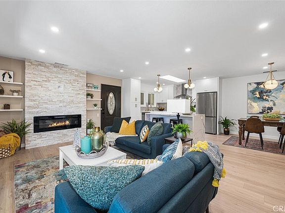 Welcome to this beautifully reimagined top-floor Casa Contenta model home, located in the desirable Third Mutual of Laguna Woods! Step inside to discover a stunning open-concept living space featuring recessed lighting and a custom floor-to-ceiling stone electric fireplace that serves as a striking focal point. Expansive dual-pane sliding doors bring the outdoors in, creating a serene, treehouse-like ambiance with an exceptional sense of privacy—no neighbors in sight. Natural light floods the home through a dramatic skylight that spans the width of the kitchen. The kitchen itself is a true showstopper, thoughtfully updated with sleek quartz countertops, stainless steel appliances, Shaker-style cabinetry, pendant lighting, and an oversized island with a breakfast bar—perfect for entertaining. Adjacent to the kitchen is a dedicated dining area accented by stylish custom lighting fixtures, ideal for hosting dinner parties or casual meals. Down the hallway, you'll find a beautifully updated guest bathroom featuring a new vanity, a fully tiled roll-in shower, and a glass enclosure. The unique floor plan includes a private primary suite, complete with a luminous white bathroom boasting quartz counters, a tiled floor, and a low-threshold glass-enclosed shower. Additional highlights include high-quality laminate flooring throughout, central air conditioning, and an in-unit washer and dryer for your convenience.This home is ideally situated within Laguna Woods, allowing residents to take full advantage of its amenities. Laguna Woods Village residents are privileged to enjoy a 27-hole championship golf course, a 9-hole executive par 3 course, pickleball and tennis courts, lawn bowling, gyms, clubhouses, swimming pools, horse stables, gardening centers, an art studio, a world-class wood shop, computer workrooms and classes + over 200 clubs and organizations!