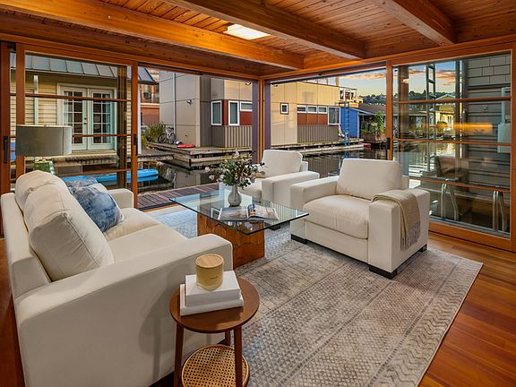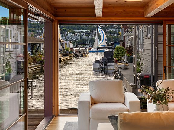 Experience serene waterfront living in this stunning 3-bedroom + den, 2-bathroom contemporary floating home, located in the highly desirable Tenas Chuck Co-op Community on Eastlake's Lake Union. This architecturally unique, Japanese-inspired residence offers unobstructed channel views in one of the most coveted spots on the lake.