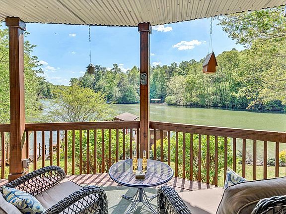 If you are searching for a quiet and peaceful waterfront home, look no further. Upon arrival, you'll note the gated, paved driveway, leading to this contemporary home situated on just under two-thirds of an acre and 265 feet of premium lakefront, deep water frontage. You will truly enjoy lake living in this updated 3-bedroom, 3-bath home. Entering the home on the main level, you will find the living room with gorgeous vaulted ceilings, a stunning stone gas fireplace, adjoining dining area, and a wall of windows with views of the water leading out to a large deck, great for entertaining. Also on the main level is the master suite, full bath with walk-in tiled shower, a beautiful eat-in chef's kitchen with breakfast bar, walk-in pantry and tons of storage. Upstairs you will find 2 bedroom (1 is the spacious loft) and another full bath. The lower level offers a comfortable family room with a second gas fireplace, a flex room (currently set up as a game room, but could be an office or converted to a 4th bedroom), the third full bath, large laundry room and additional storage room. There are two sets of sliders leading out to the covered lower deck, complete with a new hot tub. Finally, the vast dock features a stone tiki bar, perfect for summer entertaining, a single slip boat house, and floater. Also on the property is a garden or craft lakeside building and additional stationary dock to easily launch your kayaks or canoe.