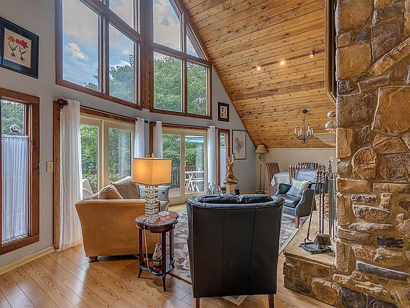Classic contemporary 3 BR, 3 BA lakefront home is perfectly situated on .61 ac. E/level offers an open floor plan that is warm, comfortable, & reflects the ultimate in taste. Walls of windows, beautiful kitchen, gorgeous floors, oven, eat-in kitchen, living room w/a floor to ceiling stone gas FP, dining area, foyer, lovely master suite w/an updated BA & expansive decking for entertaining. U/ level features 2 BR & BA. L/level includes a cozy family room w/gas FP, BA, laundry room, tons of storage, use one room as a BR, central vac & spacious decking w/hot tub. Beautiful landscaping, gated paved driveway, approx. 265 ft. of lakefront, deep water, dock, single covered slip, spacious decking, stone Tiki Bar, extra stationary dock, & the cutest garden or craft lakeside building.