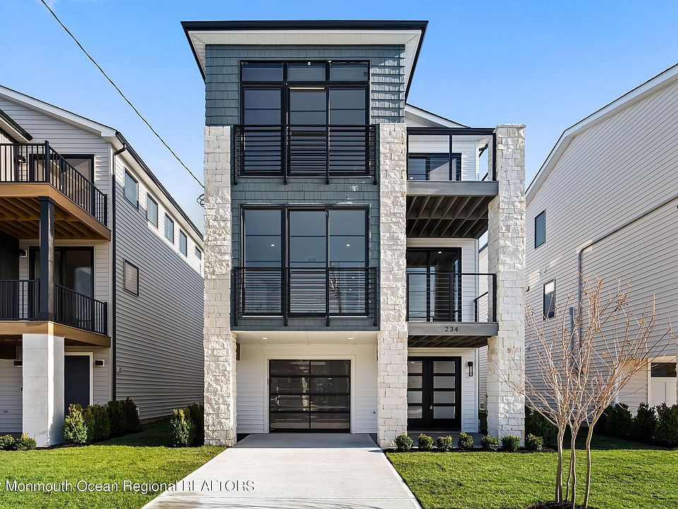 Imagine living in this beautiful modern, spacious, well-appointed, newly constructed home. This Manasquan property is located two blocks from the beach. This custom-built home has two levels of living space with hardwood flooring throughout. The first level features a spacious open floor plan. The kitchen offers a large, well-appointed quartz island adjacent to the dining room & living room. The luxurious layout naturally flows out to a spacious Deck perfect for family barbecues or relaxing in the Summer breeze. The first level has a laundry room with spacious custom cabinetry and an en-suite bedroom. The second level features a primary bedroom suite with a bathroom, custom walk-in closet, balcony, and two additional bedrooms. A full bathroom completes the second level. This home offers coastal living in true modern style, comfort, and convenience in the perfect beach town of Manasquan.