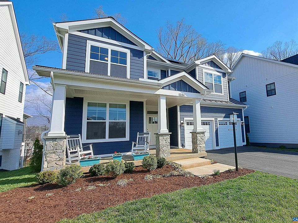 Craftsman home on Premium lot in Old Trail, off the main road, backs to common area & mountain views. It's <.5 mile by path & <1 mile by car to Western Albemarle’s public schools. An energy-efficient home w/Solar panels, heat pump hot water heater, a well-sealed home w/fresh air ventilator & more. HERS Score=20. Unfinished room in basement can easily become a 4th bedroom by adding drywall, closet & flooring. A glamorous 2-story Great Room w/coffered ceiling opens to dining & kitchen area. Kitchen has a large island w/breakfast bar, stainless steel appliances, quartz counters, a vented exhaust hood & painted maple cabinets. The Study off the foyer has glass French doors, crown molding, & additional windows. Luxury 7" oak laminate flooring is throughout the house/no carpet. Bathrooms & mudroom have ceramic tile. Primary Bedroom has a tray ceiling & huge walk-in closet. Relax on the covered front porch or the private screened porch with Trex decking. 9-ft ceilings on main & basement floors. Upgraded French doors & additional windows in Family room. 240-Volt outlet added for a future hot tub in back. 2-zone HVAC, 2-car, drywalled garage, solid-core interior doors. Lumos fiber internet or cable available.