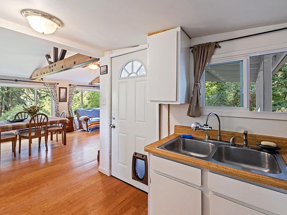 Sunlit sanctuary meets mountain magic! This charming 1950's built cabin welcomes you with vaulted beam ceilings, genuine hardwood floors that glow in the natural light, and a park-like backyard framed by towering redwoods. Start your days on the covered front porch while the open living-dining flow invites cozy evenings and easy entertaining. Generous spaces invite you to move freely and soak in the peaceful mountain energy that surrounds you. A reverse floor plan offers convenient living with good sized bedrooms & an inside laundry room with extra storage!