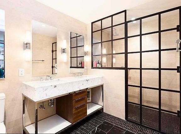 The primary suite includes a luxurious en-suite bath with framed-glass shower, Carrara-marble vanity, and Waterworks fixtures set against limestone walls. The second bedroom enjoys its own stylish full bath with custom tiling and a lacquer-and-stone vanity.