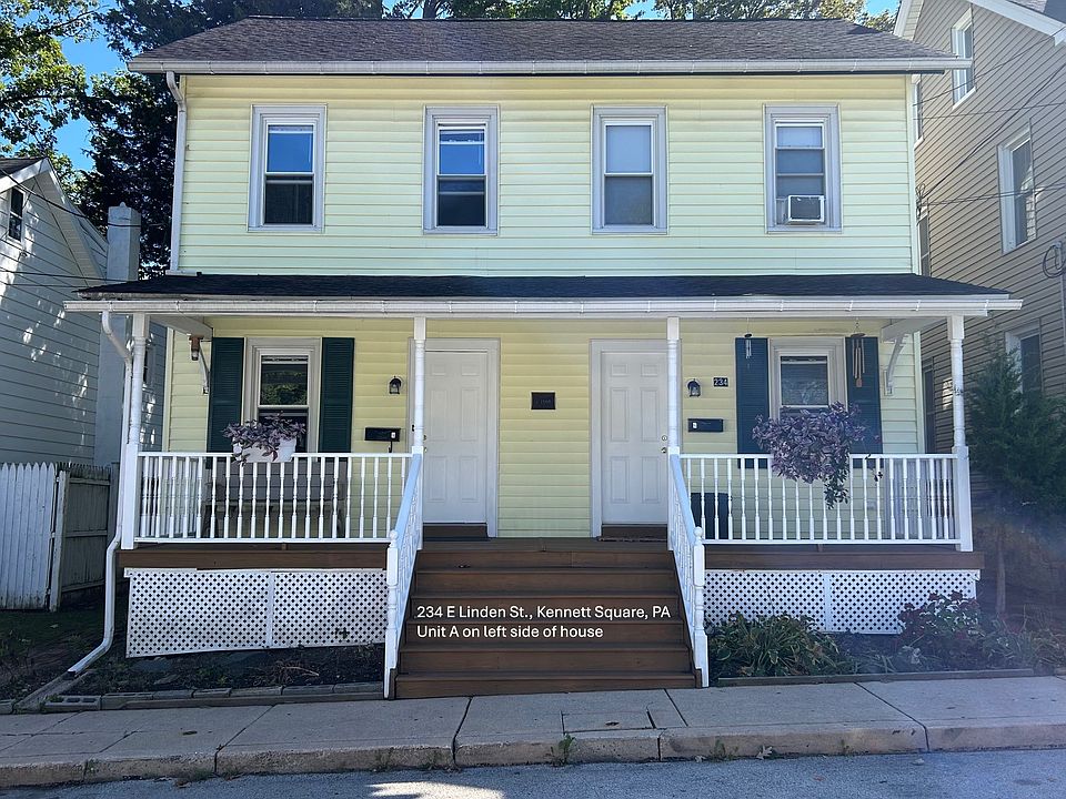 Welcome to 234 A E Linden Street in the heart of Kennett Square, available November 15th, in time for all the holiday season festivities in the borough - holiday parade, tree lighting, window displays, market village at the creamery and the New Years Eve Mushroom Drop celebration with music and entertainment. This historic duplex property is within 2 blocks of State Street, but without the noise, and walkable to everything in downtown Kennett. There is also an entrance trail to Anson B. Nixon Park directly across the street from the property. This makes it easy to enjoy everything the park offers: summer concerts, festivals, walking trails and the playground. Unit A (left side of the property) has recently been updated by the owners; freshly painted, new carpet, new vinyl bathroom flooring and toilet, new refrigerator and new high efficiency electric baseboard heating. The unit is approximately 900 square feet of finished space on 3 floors, plus an unfinished basement for laundry and storage. The first floor is an open concept living space and kitchen. The second floor includes the bathroom and 2 bedrooms. The third-floor attic can be used as an office or second family room. The front porch, back deck and backyard is shared with renters of unit B (also belonging to the same owners).
