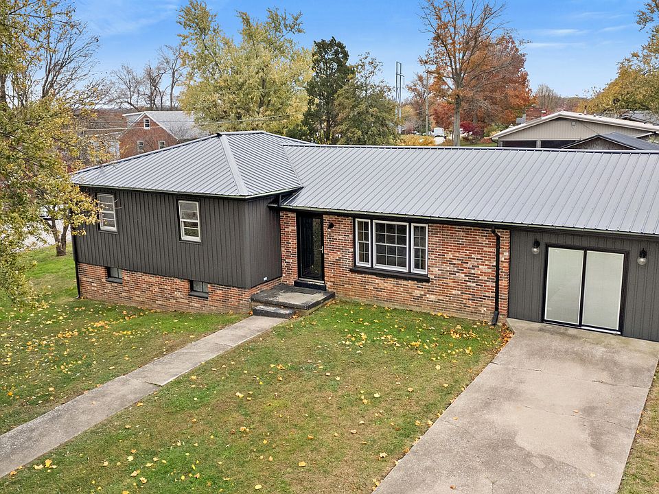Adorable and affordable! This charming 3BR/1.5BA home sits on a beautiful usable corner lot that's partially fenced and features handsome dark charcoal siding with a durable metal roof. Thoughtfully updated with stylish touches—like a stone fireplace with ventless gas logs, a tiled eat-in kitchen with white cabinetry and shiplap accents, and no carpet throughout—it's clear someone began a labor of love here. With just a few finishing touches, you can make it truly yours! Enjoy the enclosed sunroom (formerly a carport), partial basement for storage, and a large storage building. Being sold as is, but all inspections are welcome.