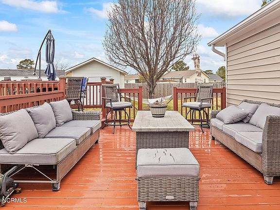 This charming 3 bedroom 2 bath property boast a newly renovated kitchen, open floor plan, and inclosed sunrooms. The fenced in back yard with extensive desk are ready for your summer adventures! Conveniently located near the back gate of Camp Lajeune this is the perfect spot and ready for its new owner.