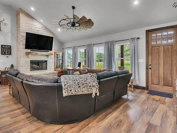 Experience serene country living in this cozy, energy-efficient farm-style home, just 15–20 minutes from Jacksboro and Graham. The open-concept floor plan features vaulted ceilings and a stone fireplace, perfect for winter gatherings. With a split-bedroom layout, the primary suite offers added privacy. Enjoy 10 fully fenced acres with a gated entry, ideal for outdoor relaxation. This peaceful retreat is a rare find—schedule your showing today!