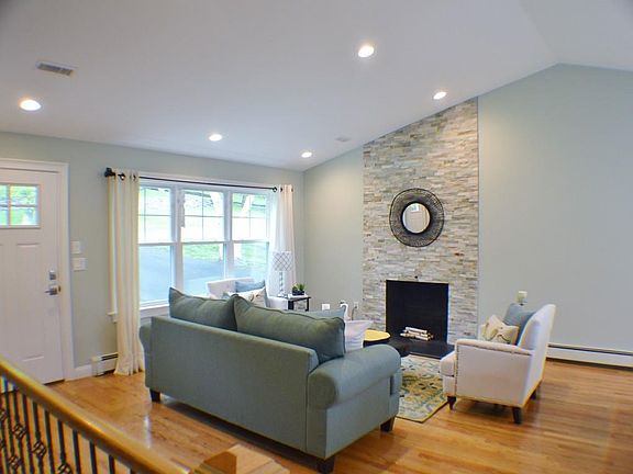 SALE TO INCLUDE BUILDER'S 1 YEAR WARRANTY!! LIKE NEW CONSTRUCTION...SPECTACULAR REMODEL!!.Stunning Open Concept Creation. Enter into a Great Room with Cathedral Ceilings where the Fireplace is Framed in Desert Quartz to the ceiling! The New Sophisticated Kitchen showcases a Large Island topped with Designer Quartz and Modern Black Stainless Steel Appliances. Deep Farmer's Sink and Microwave Drawer along with Upgraded Cabinets! Gleaming Hardwood Floors, NEW CONSTRUCTION Harvey Windows. Central Air Conditioning and A New Boiler were installed with the NEST Energy Efficient Control System. Downstairs a family room, 4th Bedroom or Office and Playroom. Walk out to a Brick Patio and enjoy the Private Yard. Kitchen has a new Exit to the large flat Back Yard. NEW DRIVEWAY ENLARGED TO FIT 4 CARS. The house next door is an example of how you could possibly expand this home from ranch to colonial!