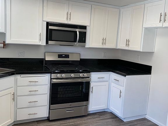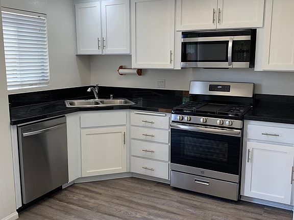 Apartment completely upgraded. Kitchen and bathrooms with BLACK GRANITE countertops and stainless dishwasher, stove and microwave with shaker style cabinets. New vinyl wood plank floors in living and dining area in kitchen and both bathrooms. Newer CENTRAL AIR. New paint. New carpet. AUTO GATE. 2 CAR GARAGE. Private patio. Owners pays trash, water, sewer and gardener. Tenant pays for gas and electricity.