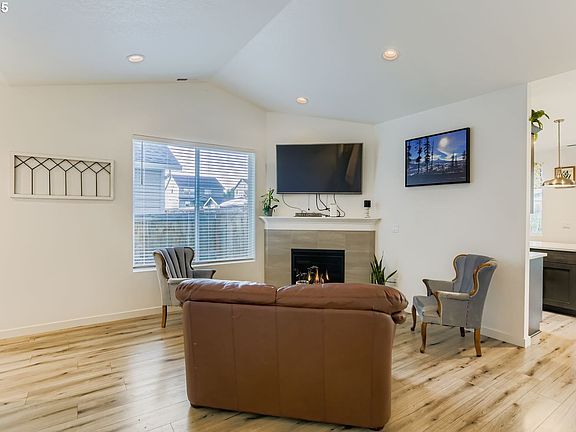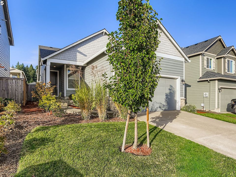 Welcome to this stunning one-level home with 1,315 sq. ft., 3 bedrooms, and 2 bathrooms, built in 2022. Designed for modern comfort, style, and functionality, this home boasts quartz countertops in the kitchen and bathrooms, laminate flooring throughout the living areas, and plush carpeted bedrooms. The kitchen island with eat bar for stools, gas stove, stainless steel sink, and pendant lighting make it perfect for casual dining, entertaining, and creating memories.The primary suite features a tray ceiling, providing a spacious and elegant retreat. The hall bathroom includes an accessible counter, combining style with convenience. The living room is inviting and cozy, complete with a gas fireplace with blower fan and dimming lights to create the perfect ambiance for relaxing or entertaining. Custom blinds throughout the bedrooms and living room add a touch of sophistication, while central air conditioning ensures comfort year-round.The garage is thoughtfully designed, plumbed for a sink, with an outlet for a fridge/freezer, insulated, and features higher ceilings for added storage or workspace. Step outside to a large covered patio with extended space, ideal for outdoor entertaining, and enjoy additional exterior outlets and Christmas light outlets. The backyard is fully fenced, beautifully landscaped, and includes a raised garden bed, perfect for gardening or enjoying the outdoors in privacy.This home perfectly blends modern amenities with thoughtful design and functional living spaces, making it move-in ready. Every detail, from strategically placed lighting to stylish finishes, has been carefully considered to create a home that is not only practical but also a joy to live in. Whether entertaining friends, enjoying quiet evenings, or cultivating your garden, this home has it all.