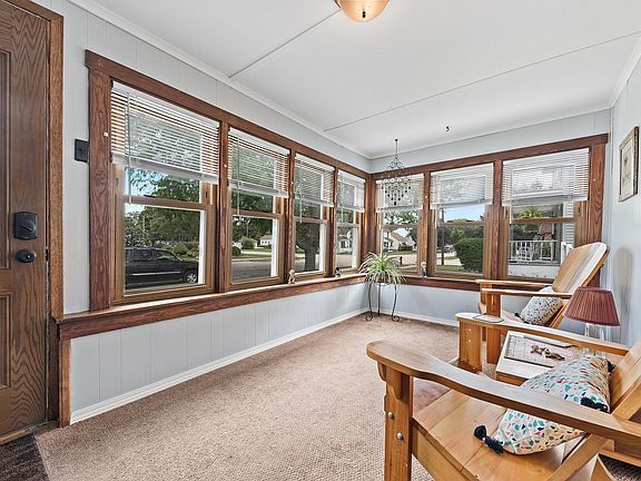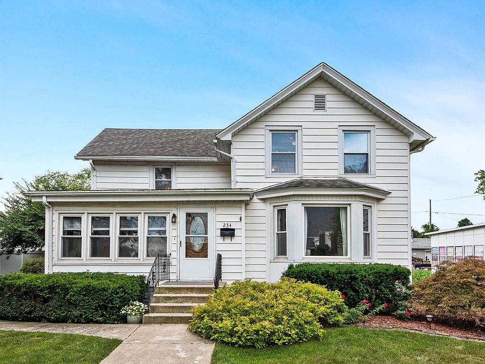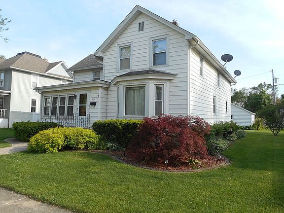 Conveniently located within walking distance to many Manteno amenities. Enjoy your coffee in the 4-season front porch or relax and enjoy the wonderful sunset views from the maintenance free deck or the patio in the lovely perennial lined backyard perfect for entertaining or family gatherings. On the 1st floor is the enclosed porch, large living room, formal dining room, eat-in kitchen, main floor bedroom with adjoining bath (currently used as office) and laundry room/mudroom. The 2nd floor has 3 large bedrooms, remodeled full bath and large walk-in attic which could easily be finished for living space or used for storage. The original woodwork, french door at entrance and staircase adds so much character & charm. Hardwood floors under carpeting on 1st floor. This home is registered with the Manteno Historical Society and has been lovingly cared for by the same family for generations. Current owner is relocating. Lots of storage.