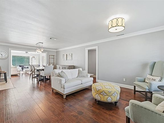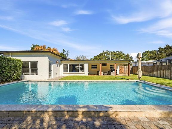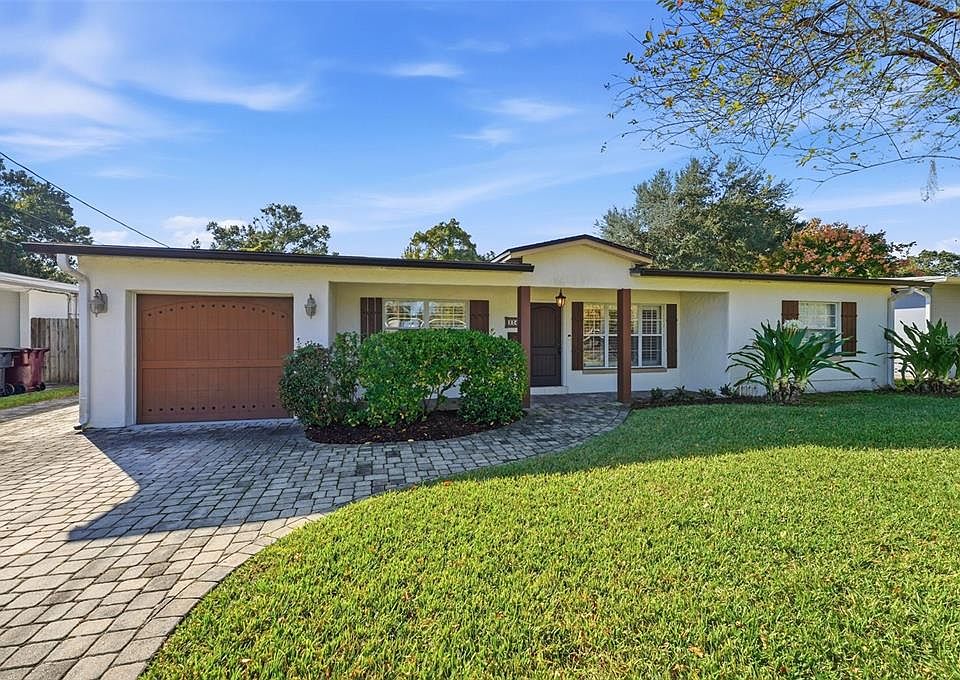 Welcome to an expansive modern ranch with elegant interior finishes and remodeled living spaces thoughtfully designed to accommodate households of all types. Set in the heart of College Park, this home sits within walking distance of AdventHealth’s Rollins Campus, the Princeton SunRail Station, the College Park Pool and Community Center, the Edgewater Drive shopping and dining district, and the historic Dubsdread Golf Course and TapRoom. As you approach, you are greeted by manicured landscaping, a fully pavered driveway and porch, and an upgraded decorative garage door with coach lights. Upon entering, you step into an impressive open living area with direct views of the private backyard and pool framed by three wide format windows. The light and bright front living room features plantation shutters, designer lighting, crown molding, and tasteful hand scraped hardwood floors that continue throughout the main living areas, creating a warm and welcoming first impression. The dining area occupies the center of this expansive flex space with pendant lighting, room for large gatherings, and seamless flow into the modern kitchen with a breakfast bar. Chefs and food lovers will appreciate the abundant counter and prep space, stylish backsplash, recessed lighting, generous cabinet storage, and a pantry with extra deep pull-out shelving for easy access to ingredients and appliances. Beyond the kitchen, an inviting family room provides a comfortable place to relax with morning coffee, enjoy wine with friends after dinner, or celebrate holidays and special occasions with wide open access to the spacious covered lanai and expansive private backyard. The completely remodeled primary suite adds a level of refinement rarely found in Orlando’s most established neighborhoods. A private entry hall opens to a room with a soaring tray ceiling, added windows, and smooth access to the backyard patio. This owner’s retreat has ample space for a king furniture suite, along with a large walk-in closet and linen closet. The ensuite spa-style bath features a generous walk-in shower with dual rain shower heads, floor to ceiling tile, a frameless glass entry, and a spacious dual glass top vanity with under-sink storage and upgraded lighting. Across the home, a second spacious bedroom with its own ensuite bath creates an ideal setup for guests who appreciate comfort and privacy. Two additional generously sized bedrooms share a third full bath with a tub shower combination and complete the interior living space of this exceptional College Park residence. The laundry and utility room sit just off the garage with interior access and an upgraded water heater. Whether you prefer staying close to home for neighborhood events like Jazz Fest or Holiday on the Drive, or taking the train to Winter Park for dinner on world-renowned Park Avenue, this location offers incredible convenience along with a peaceful retreat at the end of a short walk, bike ride, or drive home.