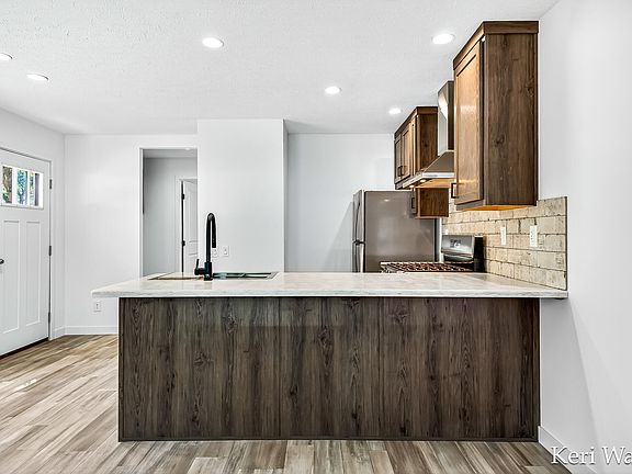 Cozy retreatRich cabinetryStainless steel appliancesStriking tile backsplash