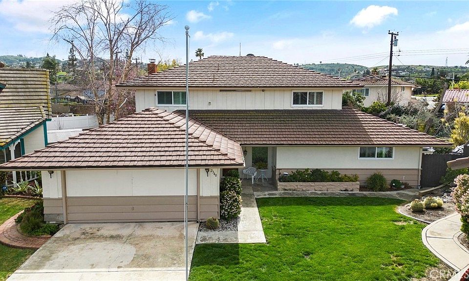 With the peaks of the San Bernardino mountains visible to the north, this mid-century modern gem is looking for someone new to love it as much as these original owners have. Great floor plan includes a first floor bedroom currently being used as an office. Four bedrooms, including primary suite, are upstairs. One upstairs bedroom also used as an office with built-in shelves for the book collector. How will you make use of all this space? Office? Bedroom? Sewing/craft room? Art studio? Kitchen has original wood flat front cabinets and opens onto the family room. Great potential here to open the space for an open concept kitchen if that's your preference. Formal living room with fireplace and formal dining room that opens onto the back yard giving it a great flow for indoor/outdoor entertaining. The pie shaped lot makes for a huge back yard that has been lovingly tended and nurtured with mature trees, lush lawn and oasis-like foliage. For the organics lover there's tiered space for your vegetable/fruit gardens. Covered patio space perfect for entertaining or enjoying visiting with the hummingbirds. Cul-de-sac location means no thru-traffic. Conveniently located near shopping, schools, places of worship and the 60 freeway. Call to schedule your showing today. REMEMBER WE SPRING FORWARD AT 2:00 AM SUNDAY 3/12 - CHECK YOUR CLOCK BEFORE YOU HEAD OVER FOR OPEN HOUSE :)