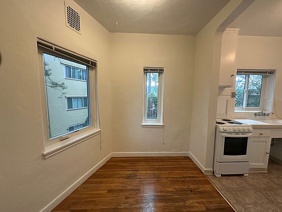 This unfurnished two-bedroom, one-bath apartment is located on the first floor of a quiet 18 unit, 3-story security building 1/2 block north of the UC Campus. (The building is on a slope, so this unit is actually about a story above the ground.) This apartment is on the south corner of the building and gets plenty of sun. The apartment is an older building with lots of character, and it has 9-foot ceilings and hardwood floors. It is approximately 900 sq. ft in size. The building is a short walk from the Downtown Berkeley BART station and the downtown Berkeley shops and restaurants. The apartment is spacious and has a dining area, two hall closets, and two bedroom closets. There is a app-operated laundry in the building. Rent is $3325/month on an initial 12 month lease, with month-to-month thereafter. Rent includes waste collection, heat, and water. There is off-street parking for an additional $65 or $75 per month. $3325 security deposit is required. The apartment is available immediately. Cats are permitted, but dogs are not.