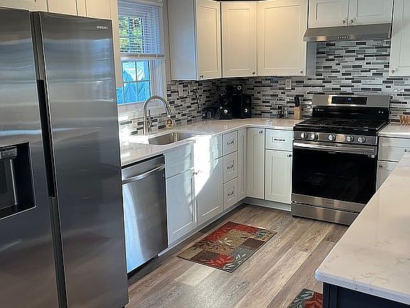Kitchen has new cabinets, quartz countertops, mosaic backsplash and LVP floor. Bath has new vanity, tiled tub and shower, lighted mirrors, tiled floor and ship lapped accent wall. Large primary bedroom with nice closet and LVP floor. All bedrooms have closets and LVP floors. Large 12X32 family room in basement.