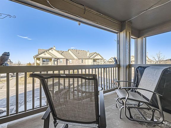 This two bedroom two bathroom condo has been beautifully updated including flooring, craftsman style trim around windows, lighting, etc. Located on the second floor, but lives like a ranch style home once inside. The living room has vaulted ceilings, new flooring, a gas fireplace, easy access to the private covered balcony (with storage), and is open to the dining room and kitchen. The primary bedroom has an en-suite with new flooring and a large walk-in closet. The secondary bathroom has new flooring, toilet, cabinets, countertop, lighting, and mirror. This home has a brand new roof installed December 2024 (Believe it is a class 5/40 year shingle), brand new HVAC system with a transferrable warranty, newer dishwasher (about 1 year old), and newer hot water heater (2022). Window coverings including draperies, ring doorbell and motion sensor camera (Subscription needed at buyers expense), shelving in secondary bedroom, and television wall mount all will be included and stay in the home. Additional features include an in-unit laundry area, a detached one car garage (#132), and a community pool with clubhouse within walking distance. Location, location, location - close to restaurants, shopping, E470, easy access to DIA, Buckley Space Force Base, etc.