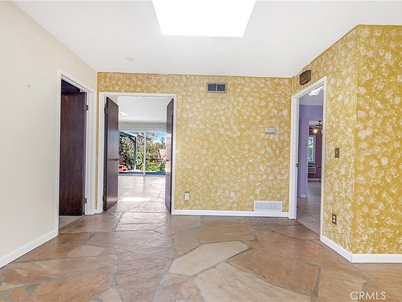 Classic 4 bed, 2 bath, 1,845 sq ft mid-century, ranch style home in a friendly residential neighborhood in Woodland Hills. Full of wonderful period touches this home is just waiting for its next occupant to make it their own! The home offers the benefit of solar panels for energy cost savings, tile floors, ceiling fans, and ample natural light throughout. Invitingly verdant front yard is gated with metal fencing and brick pillars, leading to a long walkway that guides you to a striking double-door entry. Inside, the formal entryway boasts a natural slate floor and a skylight, setting the stage for the warm mid-century ambiance. Step down into the spacious living room, where a stunning natural stone fireplace with a raised hearth becomes the focal point. Another versatile room offers flexibility, whether used as an informal living area or a formal dining room featuring slate flooring and a glass slider opening to the expansive backyard. The updated kitchen impresses with granite counters, rich wood cabinetry, a built-in gas range and a conveniently located washer and dryer, while a sunny breakfast nook invites casual dining. A large primary suite boasts dual closets and an en-suite ¾ bath. Three additional sizable bedrooms, two with wall-unit ACs share a full hall bath. Outside is a backyard designed for relaxation and entertaining, complete with a large slate patio, a brick walkway, mature landscaping—including abundant fruit trees—a covered hot tub on a raised platform, and plenty of space to enjoy the outdoors or reimagine the space. The attached two-car garage provides additional storage. Wonderfully situated near shopping, dining, entertainment, and recreation, with highly rated schools, including award-winning Welby Way, and close proximity to the Las Virgenes Canyon Preserve. Don’t let this opportunity pass you by!