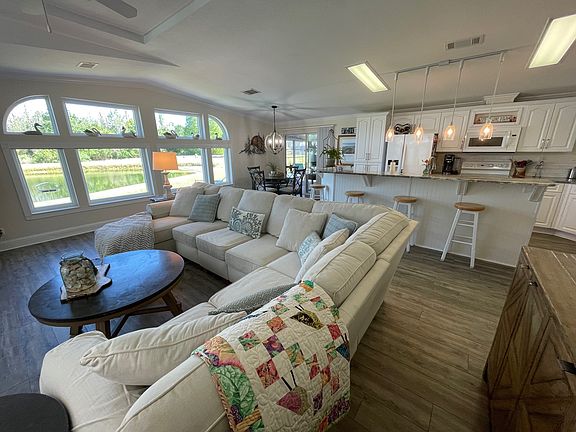 Listed by the Official Sales Team of Cypress Lakes Village ***This home is located within a 55+ resort style leased land community; age restrictions apply.*** Breathtaking views of the golf course, lake, and woods! This 2001 Palm Harbor is a spacious 2-bedroom, 2-bath home with a den boasting 1,624 SF. The views start with the lake, flowing to the #10 tee, fairway, and green of the Executive course to the woods as a backdrop. From the lanai and great room, you capture these amazing views through a full bank of windows. Off the lanai, there is an outdoor concrete patio area just waiting for a lounge chair and or grill. The great room is filled with lots of natural light through the Thermopane windows with custom blinds. The wide crown moldings as well as baseboards add to the charm of this home. The inviting neutral color palate runs throughout the home. The kitchen offers 2 pantry closets, island, and granite countertops! New lighting also adds to the charm. The Den has multiple purposes as it offers built-in cabinetry for an office, could be used as a bedroom, or craft room. The guest bedroom and bathroom are generously sized. The laundry room offers built-in cabinets for lots of storage options. The stately master bedroom offers a full walk-in closet with custom shelving. The ensuite provides a nice soaking tub, dual sinks, comfort height toilet, and walk in shower. The home is being offered partially furnished with a golf cart that has 1 year old batteries. It is ready to cruise the community. Call now for your private showing. 3 MONTHS of FREE GOLF on both our Championship & Executive Courses included in sale. ***Listing details are provided by homeowner and are not guaranteed.***