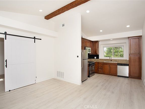Comfort, style, and convenience unite to create the perfect sanctuary, this delightful carriage unit condo in the desirable, gated community of Canyon Villas. Ascend one flight of stairs where a private and serene patio welcomes you. Once inside, enjoy an open floorplan bathed in natural light, creating an inviting and refreshing ambiance. Adjacent to the living room, the updated kitchen features stainless steel appliances, granite countertops, and a farmhouse sink. Tucked behind a stylish barn door, is the spacious bedroom featuring an ensuite bathroom and walk-in closet, providing ample storage space. Recently remodeled with attention to detail, this unit boasts fresh paint, tasteful vinyl flooring throughout, recessed lighting, and updated hardware, shutters, and doors. Additional features include beamed ceilings, A/C, a 1-car garage with storage space (no direct access), and a private laundry room complete with a full-size washer and dryer, conveniently located off the patio. Indulge in the luxury of Canyon Villas' exceptional amenities, which include two pools, spas, fitness center, and clubhouse for social gatherings. The 73 freeway, parks, scenic trails, and Aliso Viejo Town Center with shopping, dining, and a movie theater is just moments away.