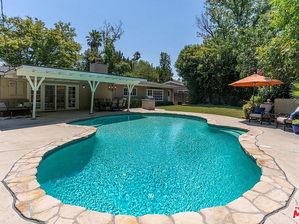 Welcome to 23415 Mariano Street, a beautifully updated single-story home set on a spacious, flat 11,123 sq ft lot in one of Woodland Hills' most desirable neighborhoods very close to Calabasas. With 4 bedrooms, 3 bathrooms, and 2,080 sq ft of thoughtfully designed living space, this home offers a perfect blend of modern upgrades and everyday comfort. Located within the award-winning El Camino Real Charter School district, it's an ideal opportunity for those seeking convenience, style, and value. Step through the double-door entry into light-filled interiors featuring vaulted ceilings, luxury plank flooring, recessed lighting, and an open, flowing layout. The family room and dining area are connected for seamless entertaining and daily living, with French doors leading out to the generous backyard. At the heart of the home is a stunning chef's kitchen, complete with white cabinetry, quartz countertops, high-end stainless steel appliances including a Sub-Zero refrigerator, double ovens, and a large center island with bar seating. A built-in bar area with additional storage adds charm and function. The primary suite offers a peaceful retreat with a bay window and built-in window seat, a walk-in closet with custom built-ins, and a renovated en-suite bathroom with dual sinks. Three additional bedrooms share a well-appointed full bathroom, and there's also a separate powder room for guests. Outside, the private spacious backyard offers a sparkling pool, covered patio for dining or lounging, built-in BBQ, and generous lawn space - an ideal setting for gatherings and making memories with family and friends. Additional highlights include updated HVAC, roof, water heater and pool equipment, along with dual-pane windows and a newer garage door and motor. Just minutes from The Village, Westfield Topanga, popular dining spots, local parks, and hiking trails, this home is a turnkey gem in a prime location.