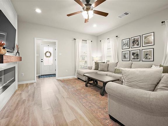 This beautifully maintained, move-in ready, 3-bedroom, 2-bath home sits in the highly desirable Hunters Ridge subdivision in Flood Zone X. Inside, you’ll find a bright, open layout with a cozy electric fireplace with shiplap surround in the living area that flows right into the dining area and kitchen with custom cabinetry, a large island, and granite countertops. The split floor plan offers great privacy, while energy-efficient features—low-E windows, radiant barrier decking, and a tankless water heater help keep utility costs reasonable.