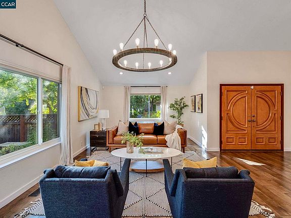 Beautiful new listing in Rudgear Meadows! No expense spared on this highly updated home that includes owned solar. Stylish Modern kitchen that features quartz counters w/tile backsplash, SS appliances, gas range, recessed lighting, under cabinet lighting & breakfast bar. The adjacent family room w/hardwood floors, recessed lighting & wood burning fireplace. The light filled formal living & dining room feature vaulted ceilings, recessed lighting, engineered wood floors & an amazing Napa inspired custom temperature-controlled wine cellar. A spacious primary bedroom w/double door entry, recessed lighting, ceiling fan & full bathroom w/dual sink vanities, walk-in closet & stall shower. There are 3 additional bedrooms & a beautifully remodeled bathroom w/two sinks & shower over bathtub. A fabulous entertainer's backyard has an outdoor grill, fire pit, custom covered patio, garden, lawn area & mini sport court all overlooking the open space & trails! So many great features that include a metal roof, owned solar, finished 3 car garage, whole house fan, dual pane windows, Central A/C, laundry room & downstairs 1/2 bath. Excellent Cul-de-sac location, adjacent to walking trails, Rudgear Meadows Pool & Rudgear park. Walnut Creek schools & Acalanes school district.