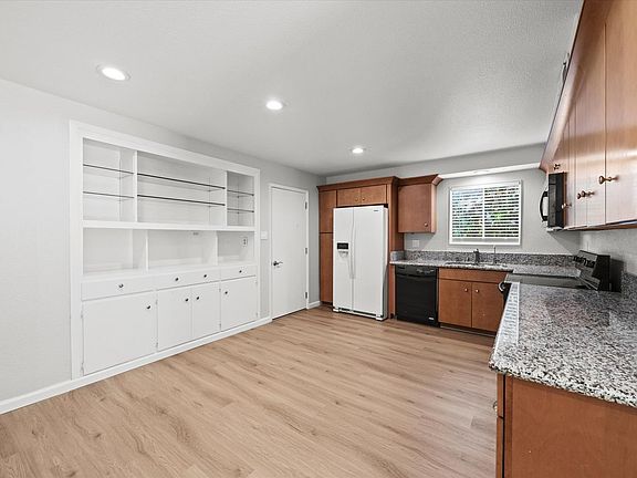 Productive fruit treesNew flooring and paintSpacious eat-in kitchenUpdated granite countersOriginal built-in hutchLoads of storageCovered patio