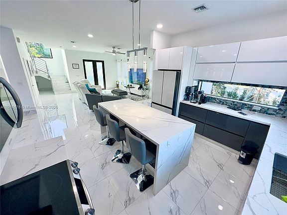 Waterfall islandFloor-to-ceiling windowsHigh ceilingsElegant finishesSleek porcelain floorsBright living spaceModern open layout