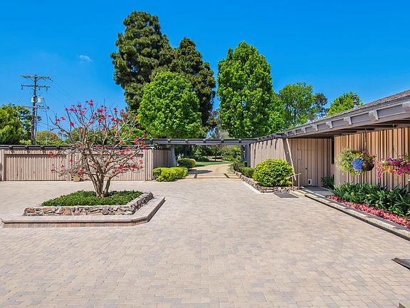 A legacy estate - six decades in the making. Available for the first time and set on an approximately 2.7-acre gated equestrian lot adjacent to Back Bay, 2342 Mesa Drive offers privacy unparalleled by any other offering in the area. A manmade lake teeming with wildlife is the focal point of the sizable grounds. Stocked with bass, bluegill and crawdads, it is large enough to attract migratory fowl and flows around the large pool as well as underneath a portion of the property, extending from its front to the back. The serene setting invites exploration, with pathways that meander over the vastness of the estate. This home is situated at the end of a winding gravel driveway bordered by mature trees, away from the gated entrance. The approximately 5,872 square foot five-bedroom residence, designed by the Mid-Century architect Philmer J. Ellerbroek F.A.I.A., was commissioned by its current owners with a dual purpose of large-scale entertaining and everyday living. This estate's main living area comprises a formal sitting room and an adjacent game room with a dramatic half-vault exposed beam ceiling. A grand and multipurpose space with access to the outside, this section features distinct conversation areas, a pool table, and the home's bar. A sanctuary of its own, the primary suite occupies the entire private wing. The owner's bedroom features views of the pool and grounds on one side, with Back Bay vistas framed by windows on the opposite wall. The secondary bedrooms are located in separate sections of the property, offering privacy. Multiple garage spaces, including converted stables near the front gate, are an ideal match for a car enthusiast.
