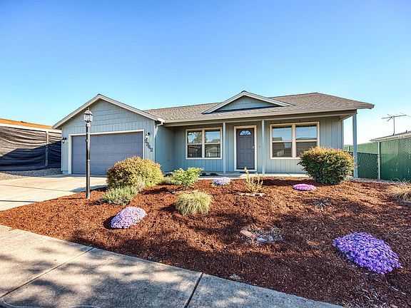 Wonderful home in the Central Point, Hidden Grove neighborhood. Built in 2005, this 3 bedroom, 2 bathroom home offers an open floor plan with vaulted ceiling and plant shelves in the living room and dining areas. Kitchen has a breakfast bar, plenty of cabinets and counter space. Primary bedroom has walk-in closet and ensuite bathroom. New floors and floor molding throughout the home in 2024, as well as interior and exterior paint. Easy-maintenance yard, covered front and back patio's, laundry room and 2-car garage. HOA Community offers tennis and basketball courts, clubhouse, pool and playground. Rental storage units and