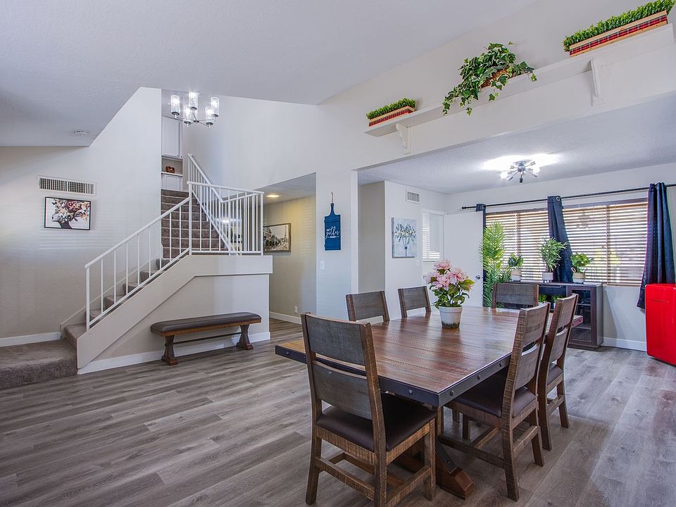 - Exterior features: Balcony, Bedroom Downstairs, Casita, Desert Landscaping, Dinning Room, Expansive Primary Suite, Flooring: Wood, French Doors, HOA Fees, Large Backyard, Newer Flooring, Newer Paint, Outdoor Dining, Quartz Countertops, Renovated Property, Sewer, Stainless Steel Appliances, Stainless Steel Refridgerator, Storage shed, Stucco, Utilities fee required, Walk In Closet, White Cabinets