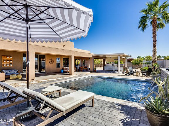 This home features an updated kitchen with maple cabinets, side by side fridge/freezer, large island, pantry, wall oven & induction cooktop. The main house includes 3 bedrooms and a office/den which could be Bed #4. The Primary Suite includes an exterior door and brand new Primary Bath with 2 vanities, gorgeous shower, and a freestanding tub. Updated guest bath. The attached Casita has a kitchenette (fridge, sink, microwave) and partially updated bath. The 4 car garage includes built-in cabinets for all your tools The saltwater pool was added in 2021. The main patio is 80ft x 10ft with an additional covered patio (2021) that features a beautiful outdoor kitchen with a large propane grill, 2 burner cooktop, cabinets, granite countertop, & ceiling fan.
